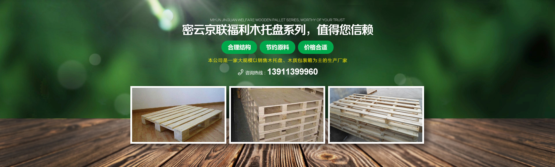 北京京聯(lián)國順木制品有限公司 (原北京市密云縣京聯(lián)福利木制品廠)成立于1993年,位于北京市密云縣西田各莊鎮(zhèn)蒼頭村,占地約5000平米。我公司工廠是一家大規(guī)模以銷售木托盤為主的生產(chǎn)廠家。本工廠是一家直接采購原木,按客戶要求生產(chǎn)規(guī)格尺寸的托盤,我公司工廠位于河北省承德市有著木材加工點(diǎn),可以做到,從山上的木頭下山到客戶手中的托盤都是一手貨,減少了中間商的費(fèi)用,所以我公司售出的產(chǎn)品對北京這個龐大的市場來說在同樣的規(guī)格尺寸的托盤來說價格比較占優(yōu)勢。